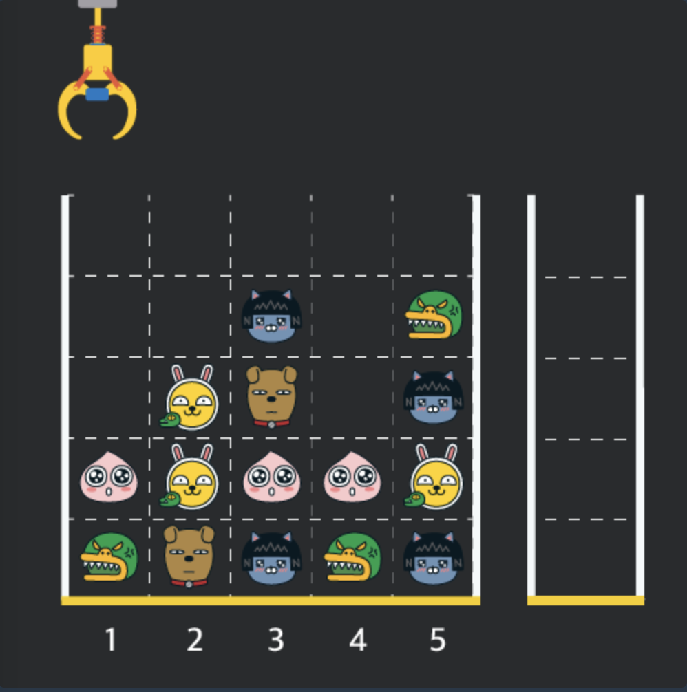 일단 문제로 넘어가서... 뭔가 2차원 Array에서 인형을 뽑아오고, 바구니에 넣어서 같은 인형인 경우에는 터트려서 사라지게하는걸 보니 !