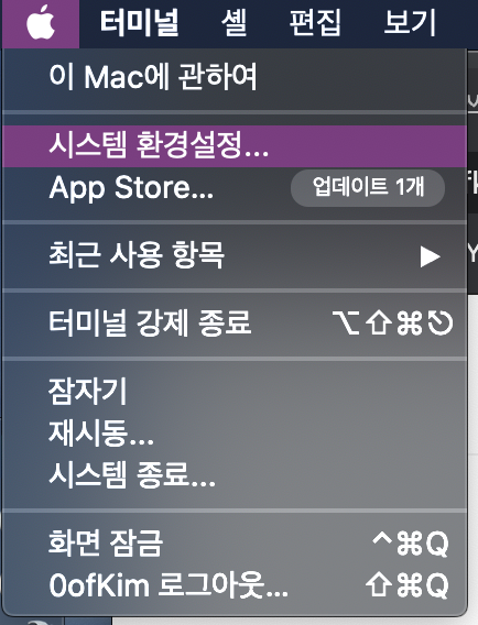1. 맥 좌측 상단의 사과 모양을 클릭 후 시스템 환경설정으로 들어가줍니다.
