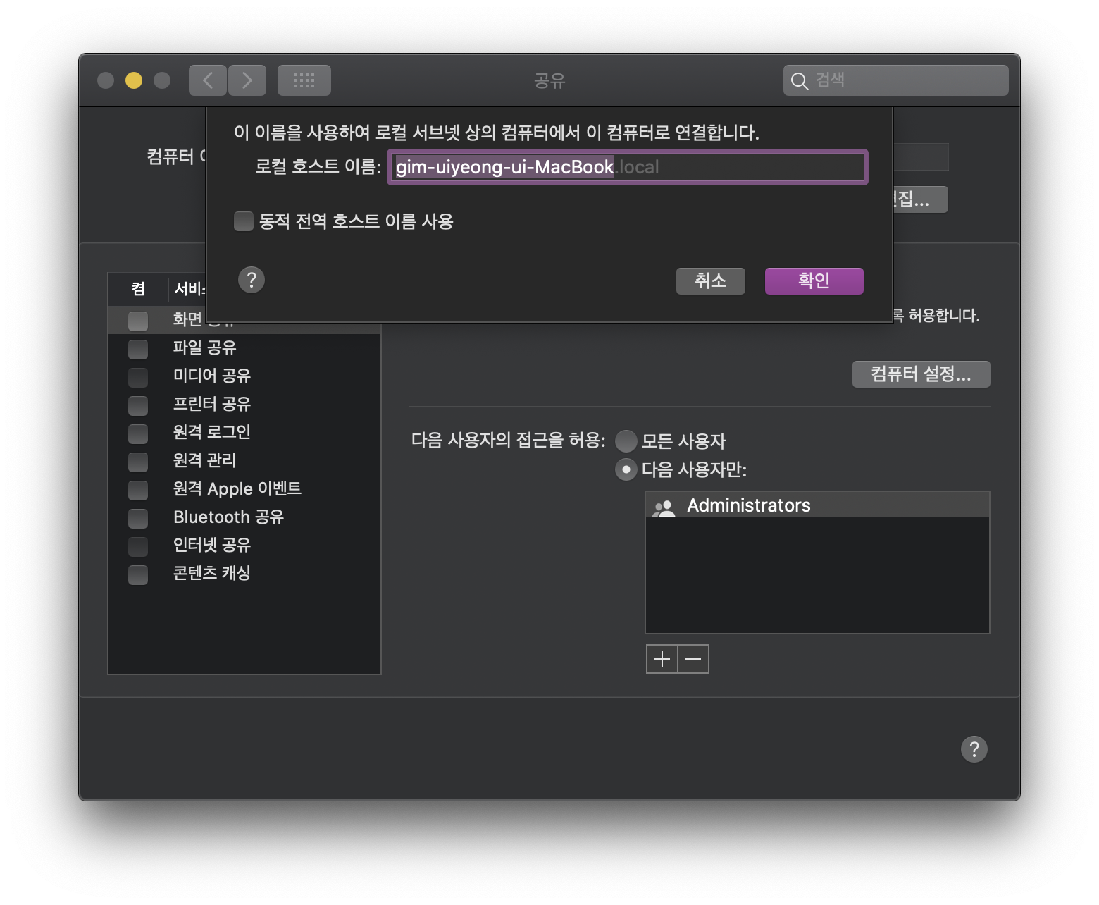5. 본인이 원하는 호스트명으로 변경해줍니다. 그리고 확인 버튼 클릭 !