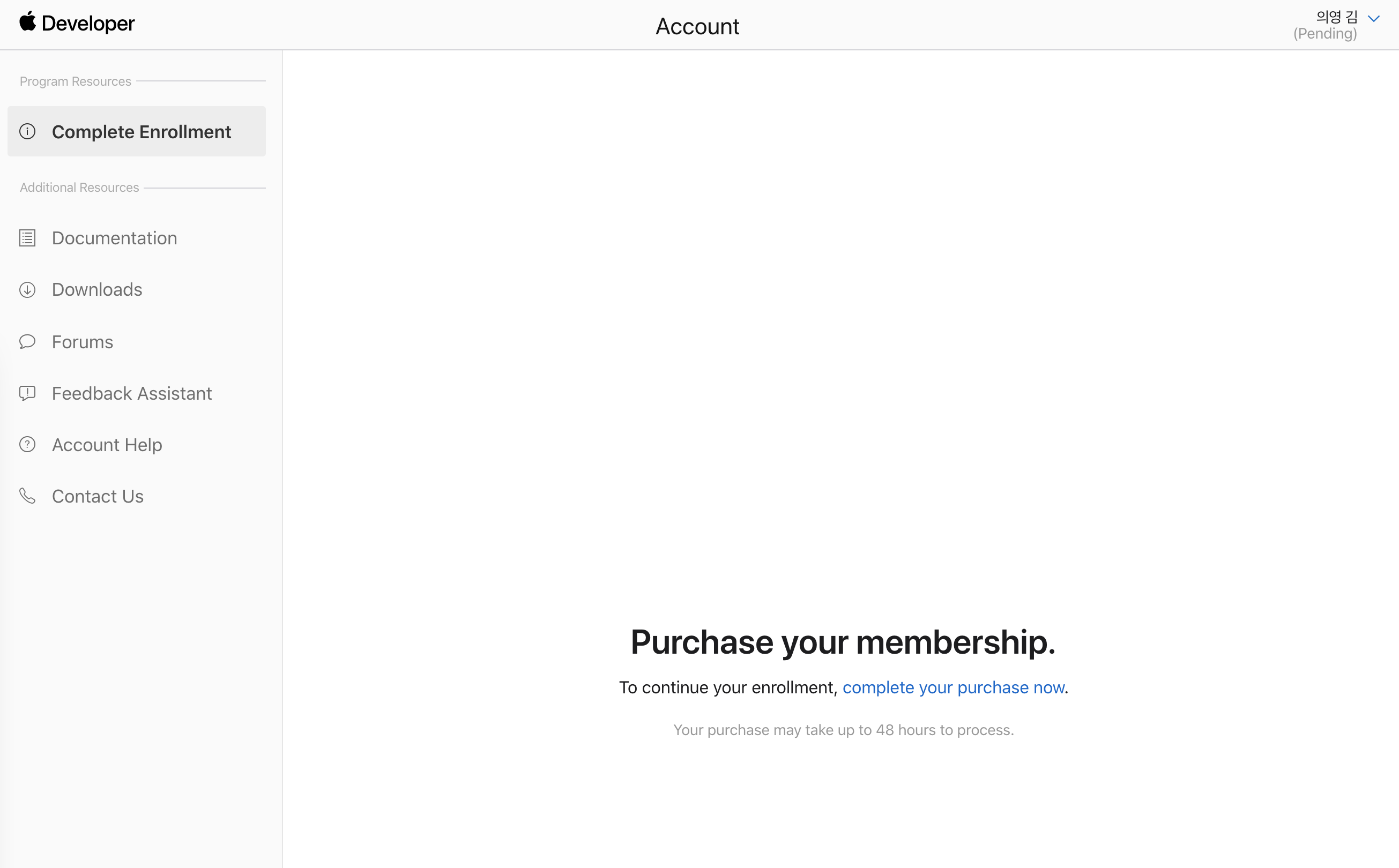 결제 승인이 나고, 개발자 승인이 완료돼야 진정 애플 개발자 등록이 완료됐다고 할 수 있는데 처리 시간은 48시간 이내라고 하네요 ~